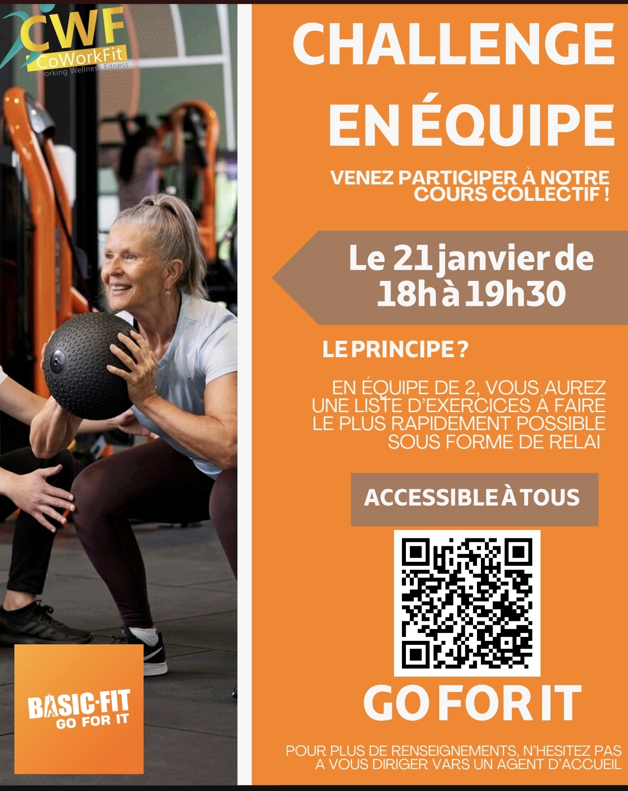 Date : Mercredi 21 Janvier , de 18h à 19h30. Le Concept : Un cours collectif intense transformé en compétition par équipes de 2. L'objectif est de réaliser un maximum de répétitions d'exercices variés (squats, abdos, pompes, etc.) dans le meilleur temps possible, en se relayant avec son partenaire. Le But : Se dépasser en équipe, battre le chrono, et voir son temps affiché sur le tableau du club ! Bonus : Un Buffet Yanga pour une récupération festive après l'effort. C'est le moment de prouver que votre équipe est la plus rapide !